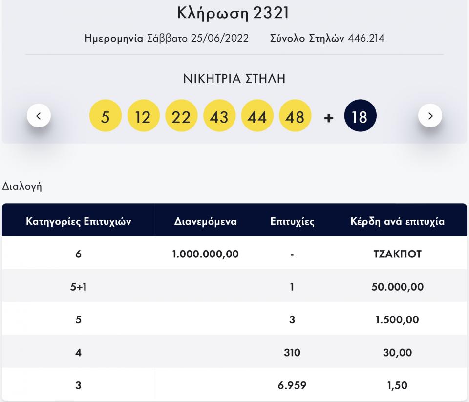 Οι έξι τυχεροί αριθμοί της κλήρωσης 2321 είναι: