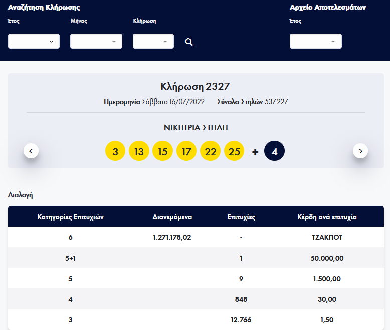 Οι έξι τυχεροί αριθμοί της κλήρωσης 2327 είναι: 3, 13, 15, 17, 22, 25