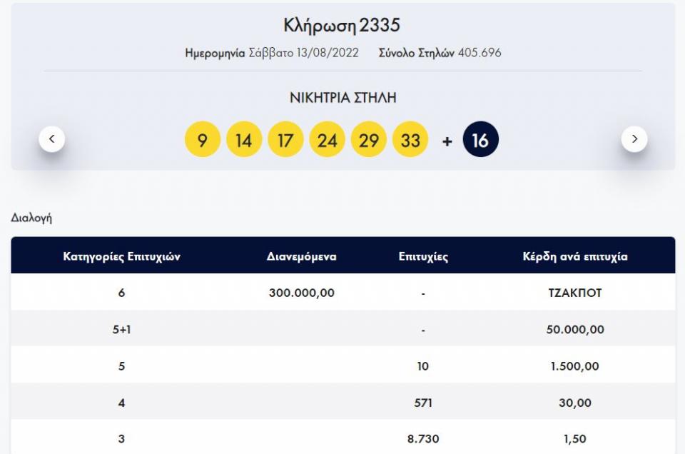 Οι έξι τυχεροί αριθμοί της κλήρωσης 2335 είναι: 9, 14, 17, 24, 29, 33