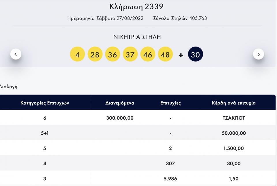 Οι έξι τυχεροί αριθμοί της κλήρωση 2339 είναι: