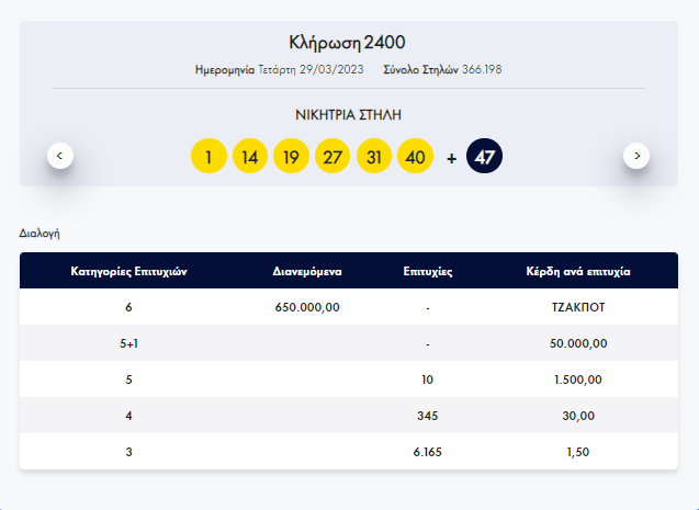 Οι έξι τυχεροί αριθμοί της κλήρωσης 2400 είναι ; 1-14-19-27-31-40
