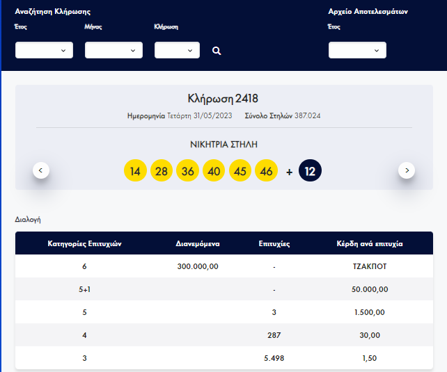 Οι έξι τυχεροί αριθμοί της κλήρωσης 2418 είναι 14 - 28 - 36 - 40 - 45 - 46