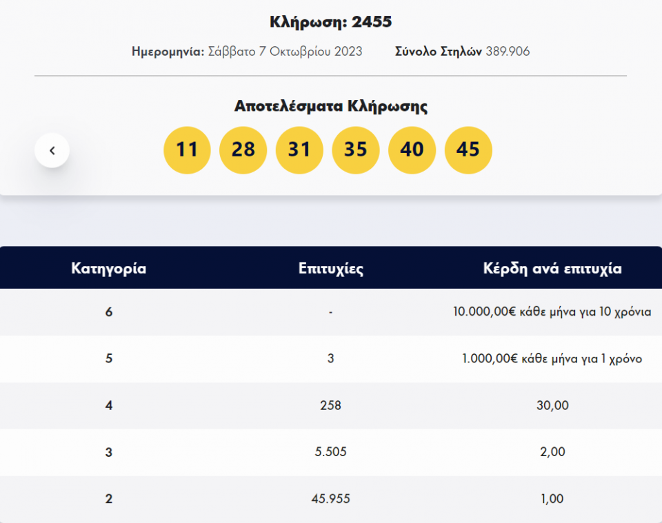 ΛΟΤΤΟ-Κλήρωση 2455-Σάββατο 7/10/2023: Αυτοί είναι οι τυχεροί αριθμοί