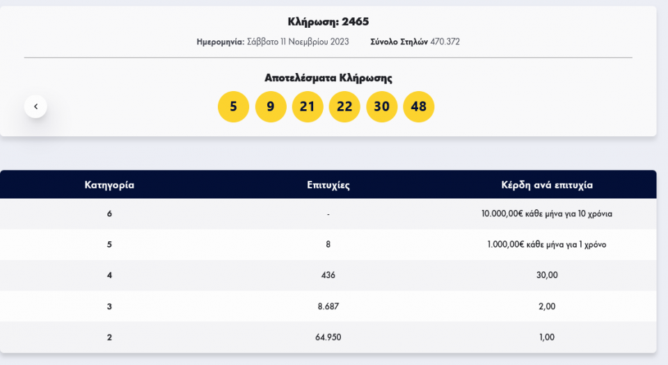 Οι έξι τυχεροί αριθμοί τηςκλήρωσης 2465 είναι: