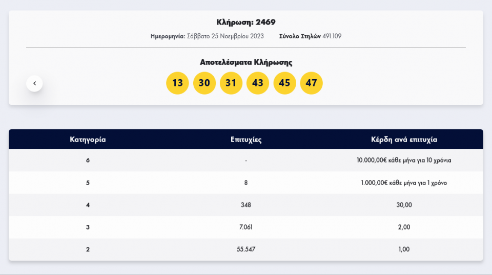 Οι έξι τυχεροί αριθμοί τηςκλήρωσης 2469 είναι: