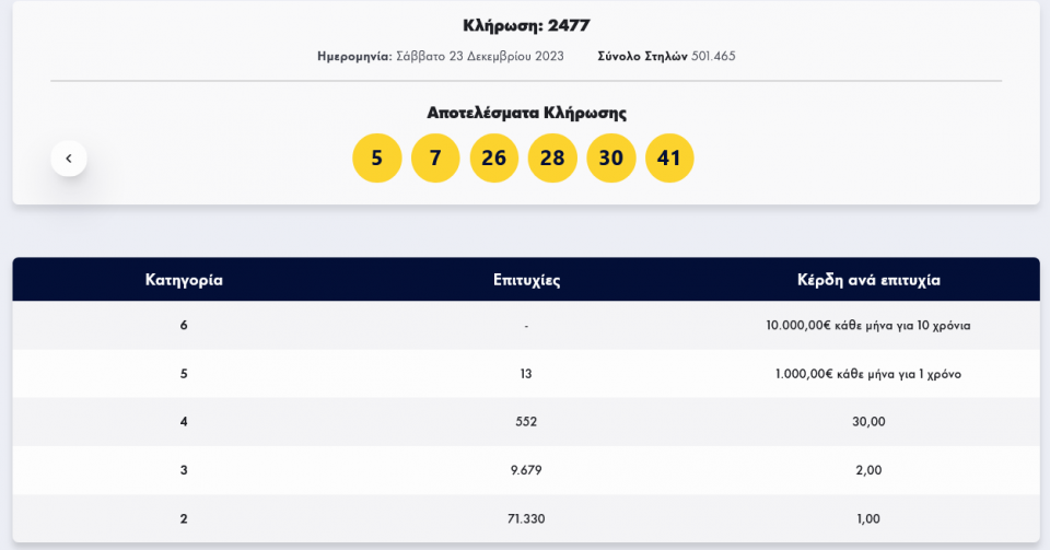 Οι έξι τυχεροί αριθμοί της κλήρωσης 2477 είναι: 5, 7, 26, 28, 30, 41