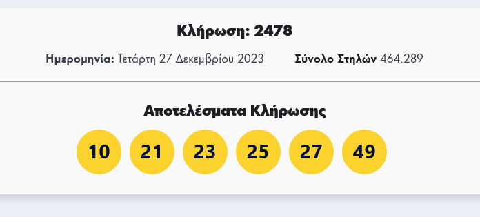 Οι έξι τυχεροί αριθμοί της κλήρωσης 2478 είναι: 10, 21, 23, 25, 27, 49.
