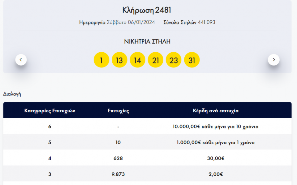 Οι έξι τυχεροί αριθμοί της κλήρωσης 2481 είναι: 1,13,14,21,23,31