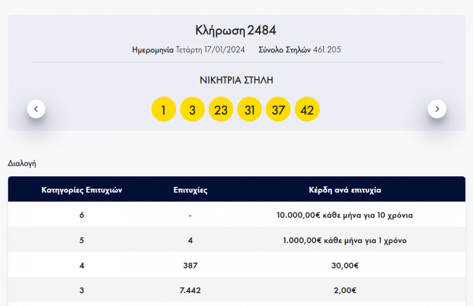 Οι έξι τυχεροί αριθμοί της κλήρωσης 2484 είναι: 1,3,23,31,37,42