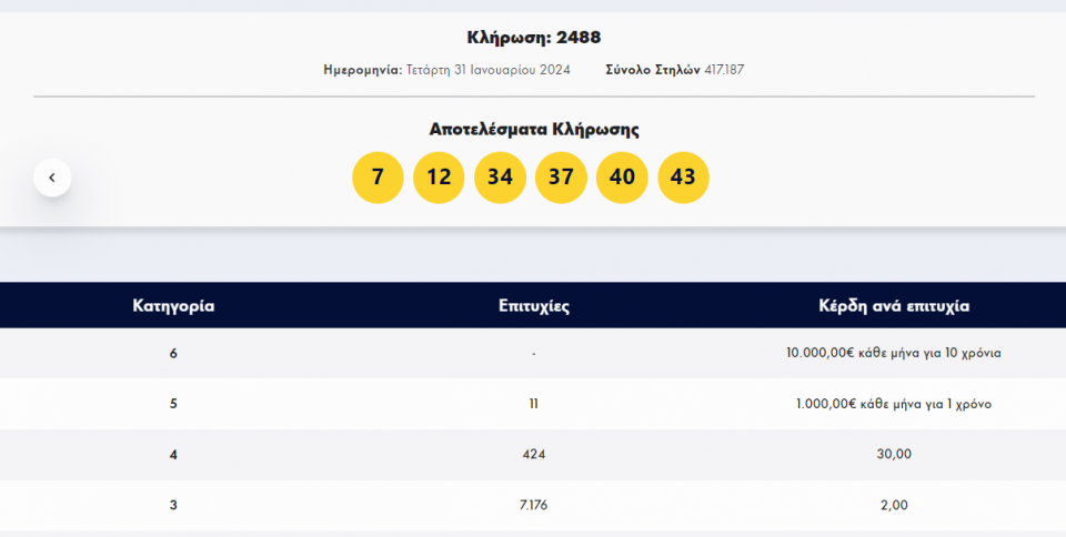 Οι έξι τυχεροί αριθμοί της κλήρωσης 248 είναι: 7,12,34,37,40,43