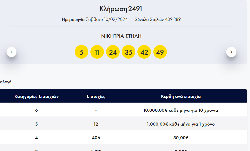 Οι έξι τυχεροί αριθμοί της κλήρωσης 2491 είναι: 5, 11, 24, 35, 42, 49