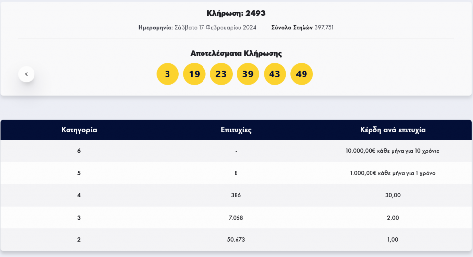 Οι έξι τυχεροί αριθμοί της κλήρωσης 2493 είναι: 3, 19, 23, 39, 43, 49
