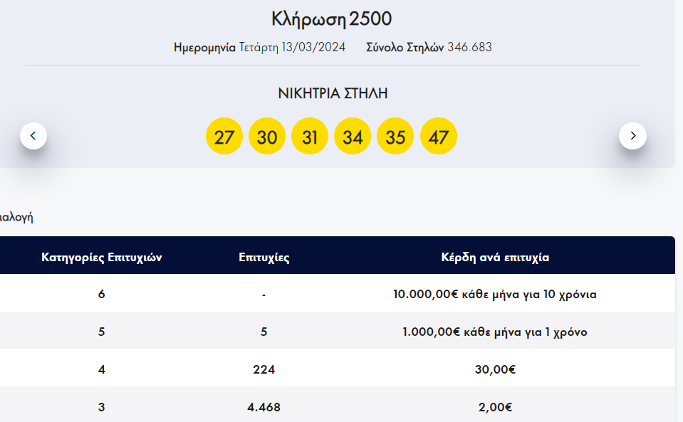 Οι έξι τυχεροί αριθμοί της κλήρωσης 2500 είναι: