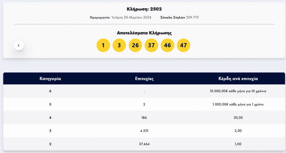Οι έξι τυχεροί αριθμοί της κλήρωσης 2502 είναι