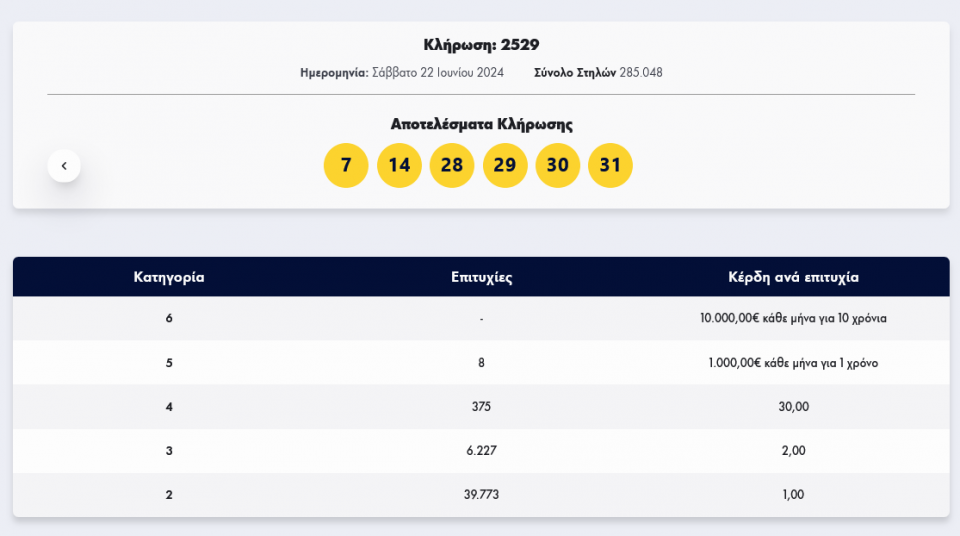 Οι έξι τυχεροί αριθμοί της κλήρωσης 2529 είναι: