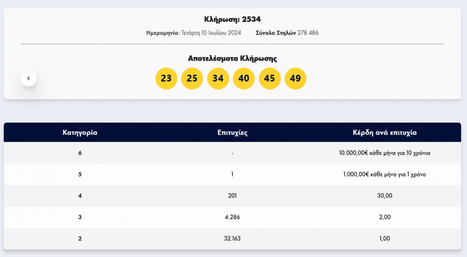 Οι έξι τυχεροί αριθμοί της κλήρωσης 2534 είναι: