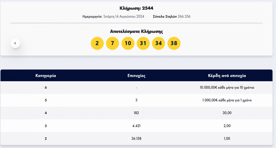 Οι τυχεροί αριθμοί είναι 2, 7, 10, 31, 34, 38