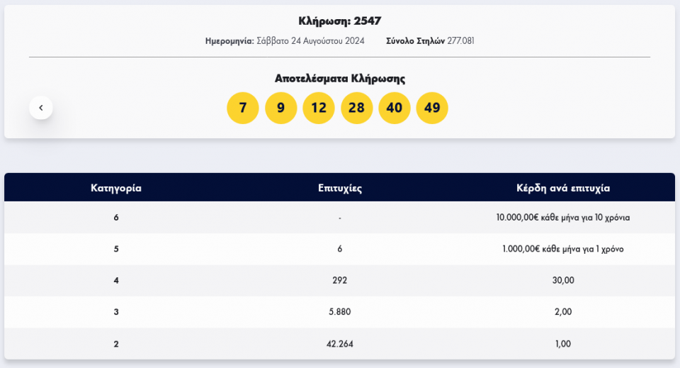 Κλήρωση ΛΟΤΤΟ αριθμός 2547, σήμερα Σάββατο 24/8/2024.