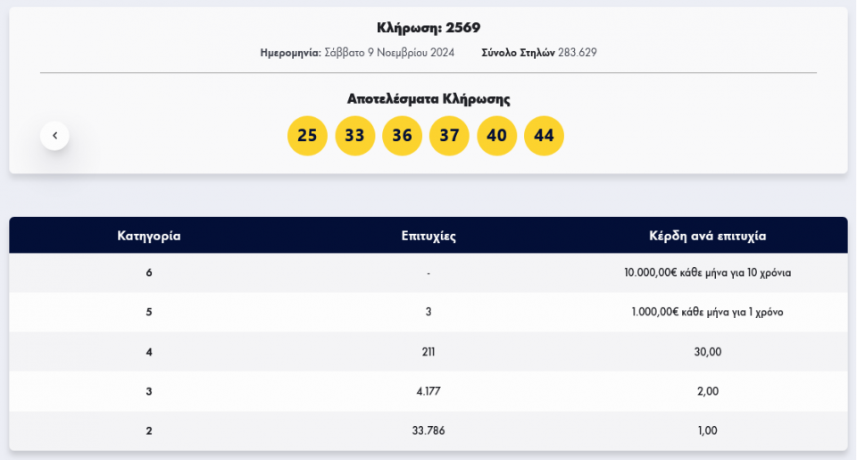 Οι τυχεροί αριθμοί είναι 33, 25, 37, 40, 36, 44.