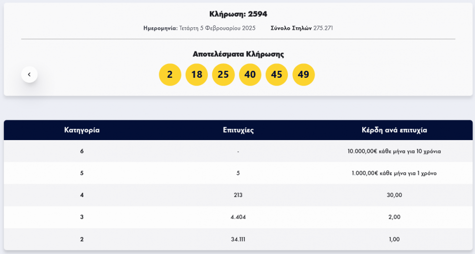 Πραγματοποιήθηκε σήμερα Τετάρτη, 5 Φεβρουαρίου 2025 η κλήρωση 2594 του ΛΟΤΤΟ που οι αριθμοί που κληρώθηκαν είναι: