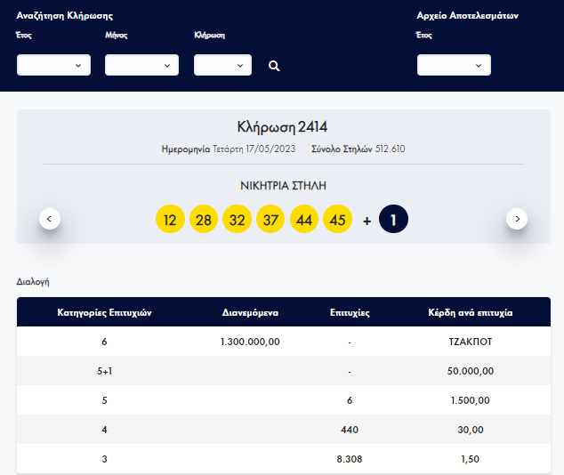 Οι έξι τυχεροί αριθμοί της κλήρωσης 2414 είναι : 12 - 28 - 32 - 37 - 44 - 45