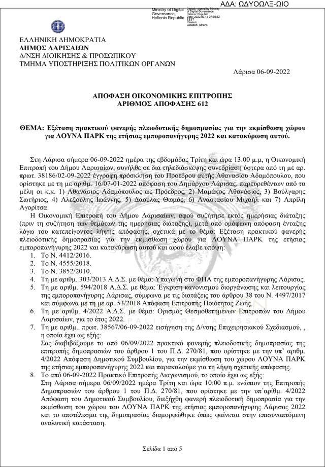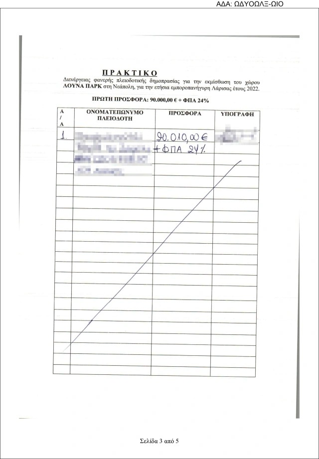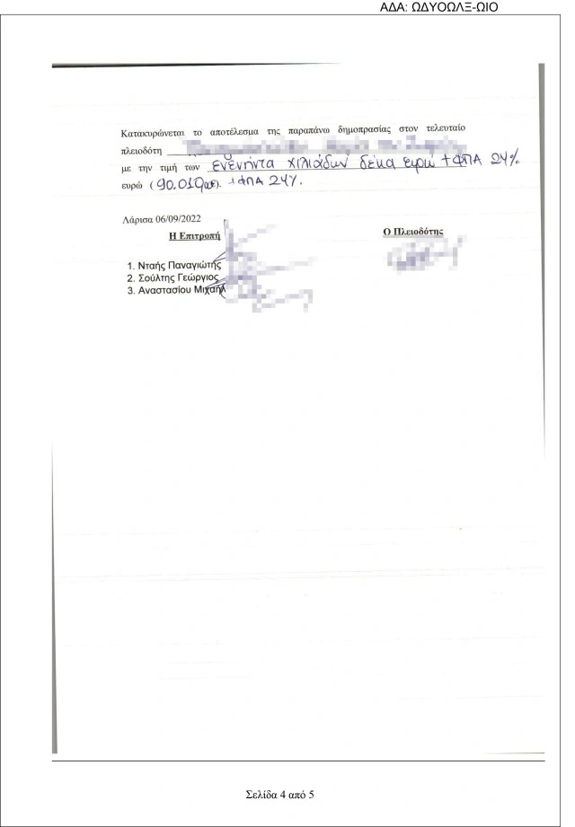 Όπως προκύπτει μάλιστα από τα σχετικά έγγραφα η απόφαση της Οικονομικής Επιτροπής του Δήμου Λαρισαίων η οποία συνήλθε δια τηλεδιάσκεψης συζήτησε εκτός ημερήσιας διάταξης την πλειοδοτική δημοπρασία και κατακύρωσε το αποτέλεσμά της στην 78χρονη επιχειρηματία.