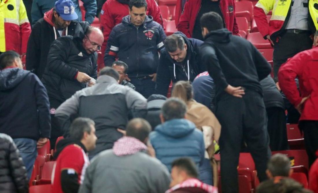Ο οπαδός του Ολυμπιακού , που καθόταν στην κερκίδα πάνω από την φυσούνα, φαίνεται πως δεν άντεξε την ένταση της αναμέτρησης και τη συγκίνηση που είχε το ματς στα τελευταία λεπτά και κατέρρευσε στις κερκίδες .