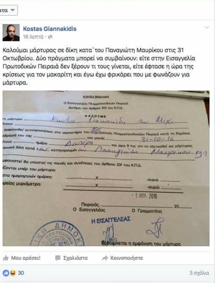 Ως μάρτυρας στην υπόθεση του Παναγιώτη Μαυρίκου κλήθηκε από την Εισαγγελία Πρωτοδικών Πειραιά ο δημοσιογράφος Κώστας Γιαννακίδης.
