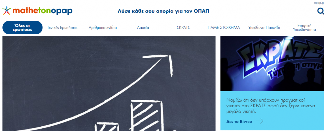 Το αποτελεί ένα κανάλι διαλόγου και παρέχει στους επισκέπτες αναλυτικές πληροφορίες καθώς και multimedia υλικό, που απαντά σε συχνές απορίες όπως: «Πώς αυξάνεται το ποσό όταν έχει τζακποτ στο ΤΖΟΚΕΡ ;» «Κερδίζει κανείς μεγάλα ποσά στο ΣΚΡΑΤΣ ;» «Μόνο ομάδες δεν χορηγεί ο ΟΠΑΠ ;»