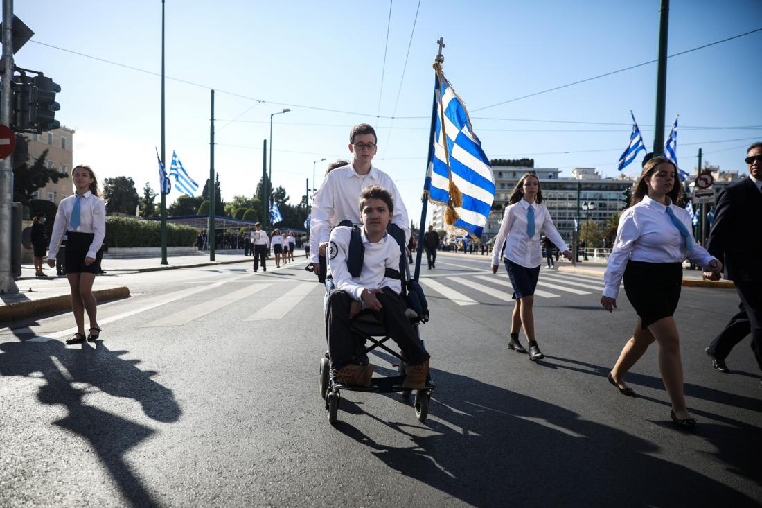 Mαθητική παρέλαση για την επέτειο της 28ης Οκτωβρίου, στο κέντρο της Αθήνας. H πρώτη παρέλαση μετά από δύο χρόνια, εξαιτίας της πανδημίας. Συμμετείχαν όλα τα σχολεία της Α' Αθήνας, 235 δημοτικά, γυμνάσια και λύκεια.