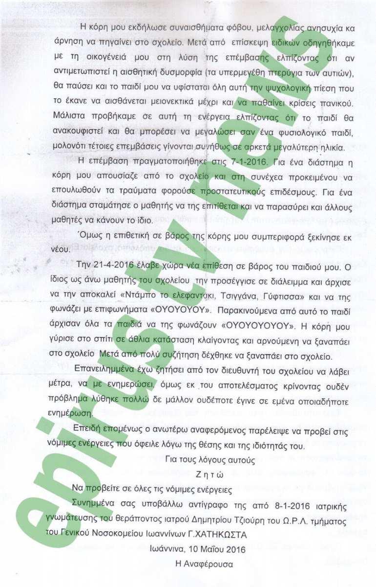 Η καταγγελία της μητέρας στο epirus-tv-news συγκλονίζει καθώς ισχυρίζεται πως η κόρη της αναγκάστηκε να βρεθεί στο χειρουργικό κρεββάτι μετά το bullying που δεχόταν επί σχεδόν δύο χρόνια απο μαθητή μεγαλύτερης τάξης στο Δημοτικό Σχολείο, όπου φοιτούσε.