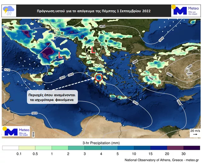Στον χάρτη που ακολουθεί, παρουσιάζεται ενδεικτικά ο υετός που αναμένεται τις απογευματινές ώρες της Πέμπτης (01/09), ενώ σημειώνονται και οι περιοχές όπου αναμένονται τα ισχυρότερα φαινόμενα.
