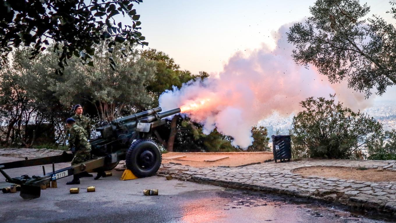 Στις 06:21 το πρωί έγινε ρίψη 21 χαιρετιστήριων βολών από το πυροβολείο του Λυκαβηττού και εκτέλεση Εωθινού από τμήματα μουσικής των Ενόπλων Δυνάμεων και των Σωμάτων Ασφαλείας.