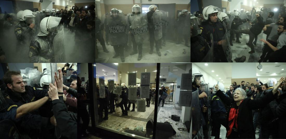 Με ΜΑΤ και άγριο ξύλο, αστυνομοτρομοκρατία, με τα χημικά να πέφτουν και σε κλειστό χώρο, τραυματισμούς, κ.λπ. ξανάρχισαν χτες οι πλειστηριασμοί. Κατάσταση χάους στο Ειρηνοδικείο Αθηνών όπου συγκεντρώθηκαν μέλη των κινημάτων για να εμποδίσουν τους πλειστηριασμούς.