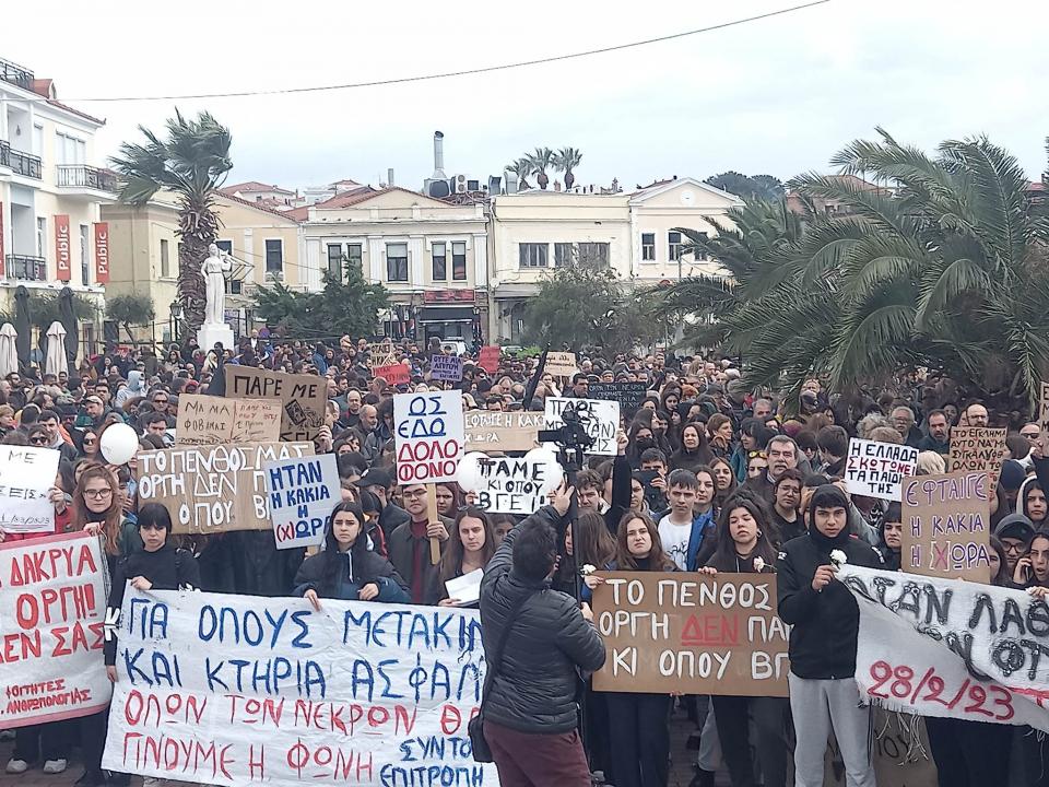 Μετά την μεγάλη συγκέντρωση της περασμένης Παρασκευής νέο συλλαλητήριο του Εργατικού Κέντρου Λέσβου βρίσκεται σε εξέλιξη στην Πλατεία Σαπφούς, με την συμμετοχή, μαθητών, φοιτητών, φορέων με αίτημα να μην υπάρξει συγκάλυψη της υπόθεσης της τραγωδίας στα Τέμπη.