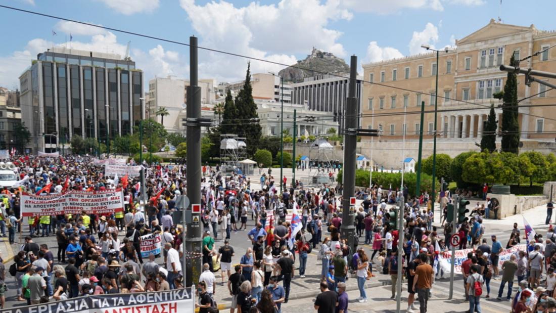 Πλήθος κόσμου διαδήλωσε, με πανό και συνθήματα κατά του νομοσχεδίου, το οποίο χαρακτηρίζουν «αντεργατικό έκτρωμα» και ζήτησαν να μην ψηφιστεί από τη Βουλή