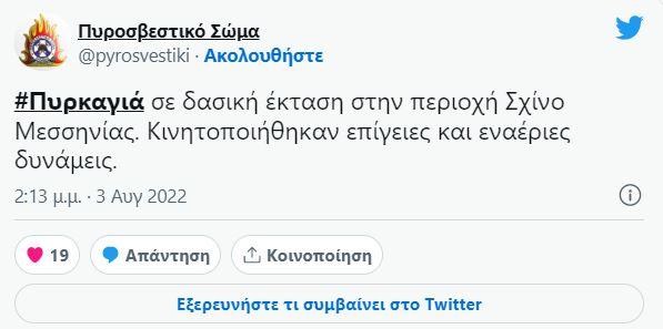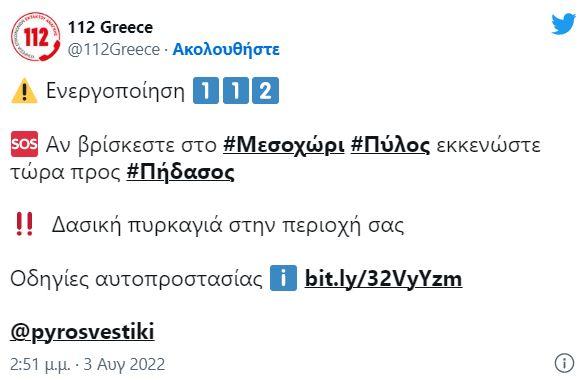 Μάλιστα συάλθηλε μήνυμα, μέσω της υπηρεσίας επικοινωνιών έκτακτης ανάγκης 112 του υπουργείου Κλιματικής Κρίσης και Πολιτικής Προστασίας, σε όσους βρίσκονται στην περιοχή Μεσοχώρι, της Πύλου, ώστε να εκκενώσουν προληπτικά την κοινότητα και να κινηθούν προς την περιοχή, Πήδασος.