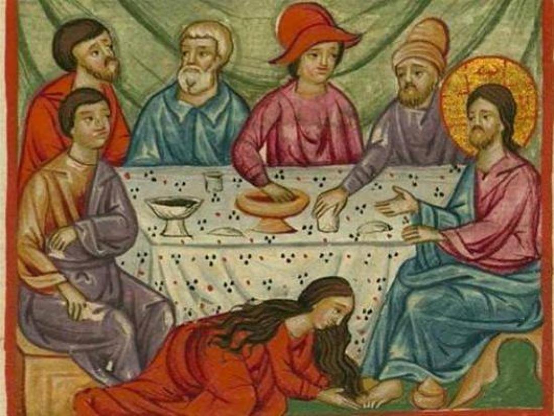 Σύμφωνα με το ευαγγέλιο του Ιωάννη, ο Ιησούς προσκλήθηκε σε δείπνο στο σπίτι του Σίμωνος που άνηκε στην τάξη των Φαρισαίων. Επίσης στην πόλη βρισκόταν μία πόρνη που μόλις έμαθε ότι ο Ιησούς ήρθε στην πόλη θέλησε να μάθει σε ποιο σπίτι ήταν προκειμένου να πάει για να τον συναντήσει.