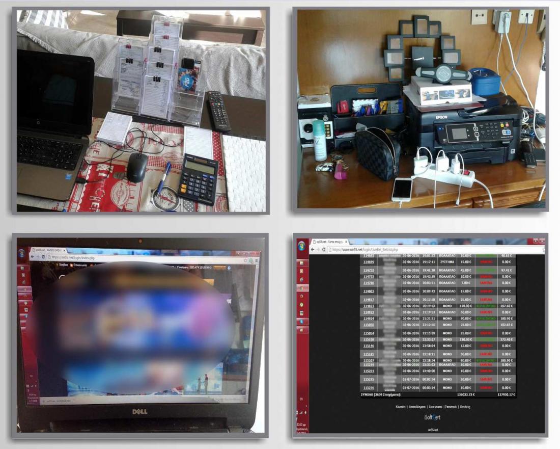 Επίσης, βρέθηκαν 271 γνήσια δελτία στοιχήματος Ο.Π.Α.Π., συνολικού χρηματικού ποσού 569.322,1 ευρώ, χρονικού διαστήματος από τον Απρίλιο του 2015 έως τον Ιούνιο του 2016, με αντίστοιχες και ισάριθμες αιτήσεις πληρωμής και αντιγράφων ενταλμάτων πληρωμής στο όνομα του 41χρονου συλληφθέντα.