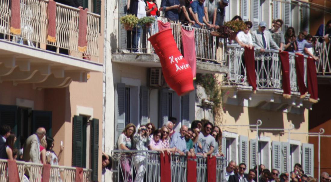 Με το σήμα της πρώτης Ανάστασης στις 12μμ, οι κάτοικοι της Κέρκυρας πετούν τεράστια κανάτια γεμάτα νερό – τους μπότηδες – από τα μπαλκόνια τους. Οι μπότηδες είναι τα πήλινα κανάτια με στενό στόμιο και δυο χερούλια στο πλάι για τη μεταφορά τους. Τα μπαλκόνια είναι στολισμένα και οι κάτοικοι δένουν στους μπότηδες κόκκινες κορδέλες – το κόκκινο είναι το χρώμα της Κέρκυρας.