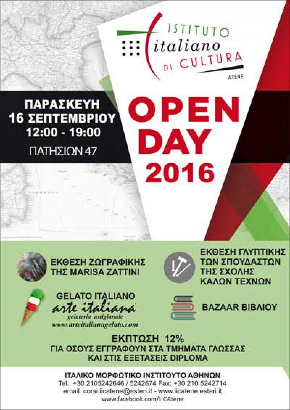 Το Ιταλικό Μορφωτικό Ινστιτούτο Αθηνών, όπως κάθε χρόνο, ανοίγει τις πόρτες του στο κοινό με εκδηλώσεις τέχνης και πολιτισμού την Παρασκευή 16 Σεπτεμβρίου 2016, από τις 12.00 έως τις 19.00.