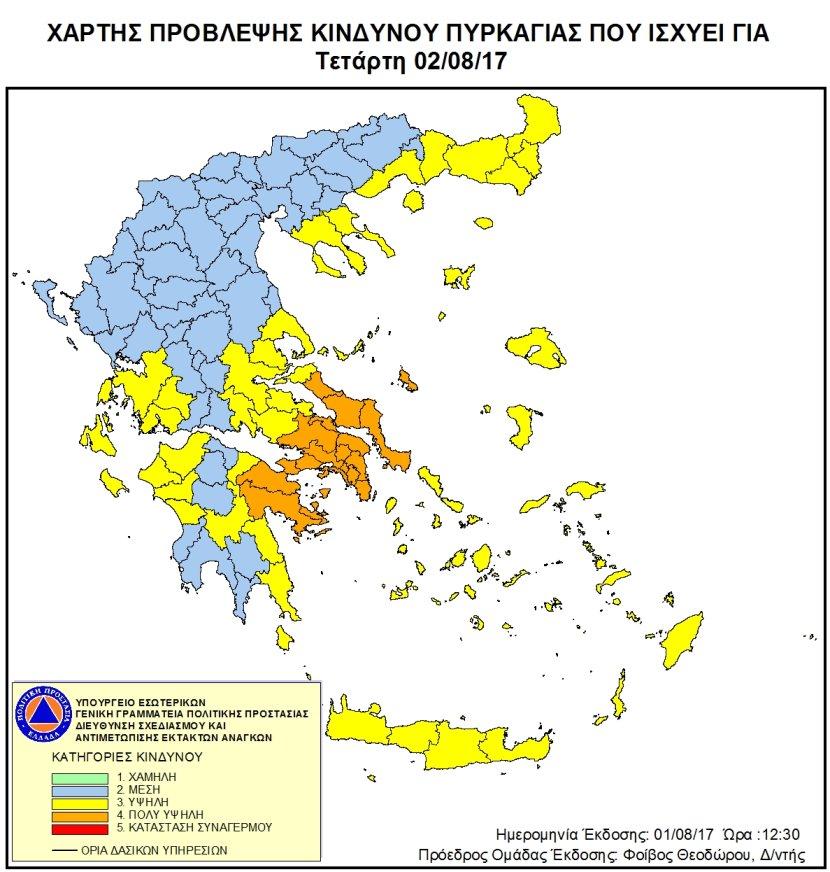 Σύμφωνα με το Χάρτη Πρόβλεψης Κινδύνου Πυρκαγιάς που εκδίδει η Γενική Γραμματεία Πολιτικής Προστασίας του Υπουργείου Εσωτερικών (www.civilprotection.gr), για την Τετάρτη 2 Αυγούστου, προβλέπεται πολύ υψηλός κίνδυνος πυρκαγιάς (κατηγορία κινδύνου 4) για τις περιοχές Περιφέρειας Αττικής, Στερεάς Ελλάδος (Εύβοια, Βοιωτία) και Πελοποννήσου (Κορινθία, Αργολίδα).