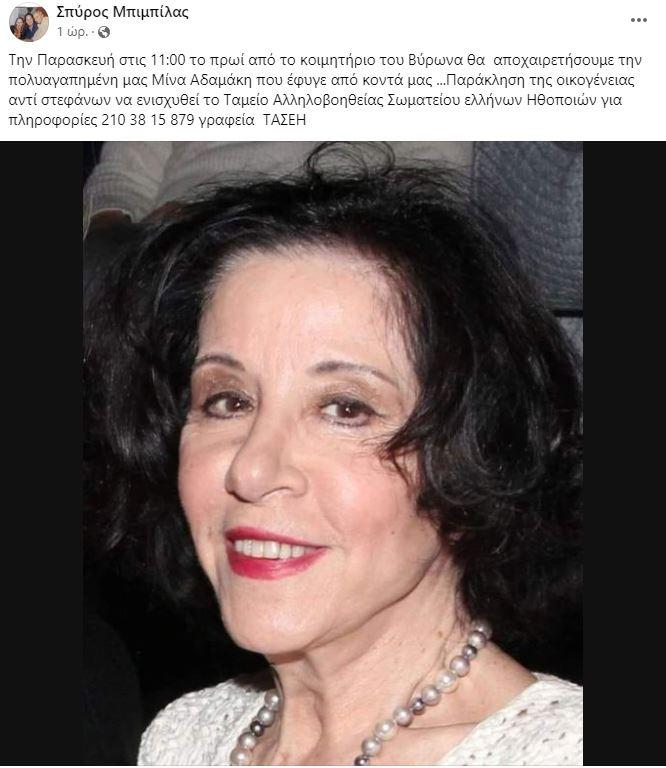 «Την Παρασκευή στις 11:00 το πρωί από το κοιμητήριο του Βύρωνα θα αποχαιρετήσουμε την πολυαγαπημένη μας Μίνα Αδαμάκη που έφυγε από κοντά μας …Παράκληση της οικογένειας αντί στεφάνων να ενισχυθεί το Ταμείο Αλληλοβοηθείας Σωματείου Ελλήνων Ηθοποιών για πληροφορίες 210 38 15 879 γραφεία ΤΑΣΕΗ» έγραψε σε ανάρτησή του ο Σπύρος Μπιμπίλας.