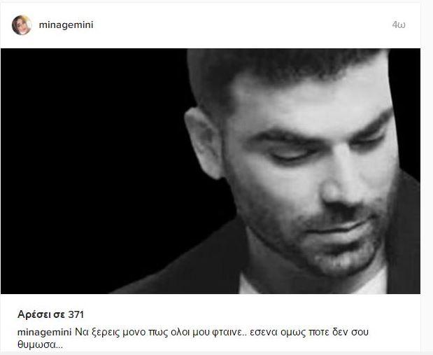 Στη λεζάντα που συνόδεψε τη φωτογραφία η Μίνα έγραψε: «Να ξέρεις μόνο πως όλοι μου φταίνε... εσένα όμως ποτέ δεν σου θύμωσα...».