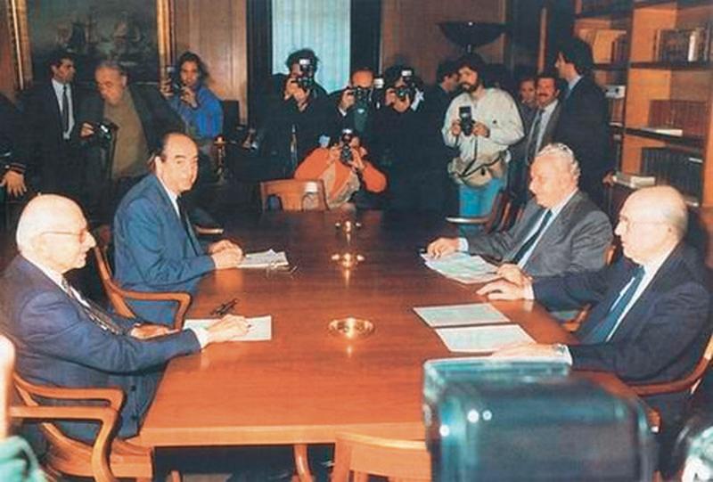 Αποφασίστηκε σε σύσκεψη µε τον Πρόεδρο της ∆ηµοκρατίας Χρήστο Σαρτζετάκη των Παπανδρέου - Μητσοτάκη - Φλωράκη, όπως ορίζει το Σύνταγµα: αν τα τριήµερα ανάθεσης διερευνητικών εντολών σε κάθε κόµµα δεν τελεσφορήσουν, τότε καλεί όλους τους αρχηγούς σε σύσκεψη µήπως και προκύψει λύση.