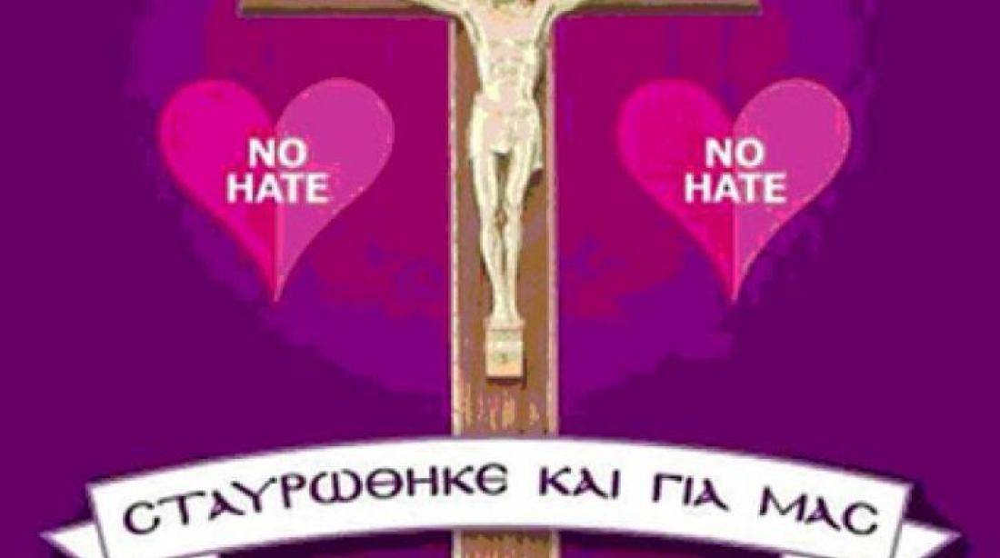 Στις δύο πλευρές εκατέρωθεν του Εσταυρωμένου θέτουν τήν επιγραφή "No HATE", δηλ. «ΟΧΙ ΜΙΣΟΣ»! Ο Χριστός όμως συχαίνεται τους Σοδομίτες! Έστειλε φωτιά από τόν ουρανό και τους κατέκαυσε!