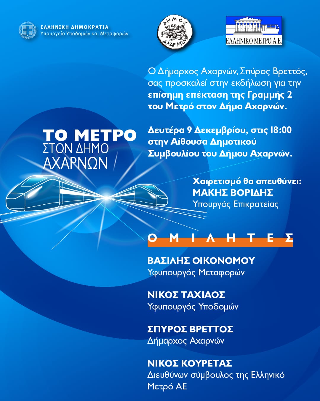 Το παρών στην εκδήλωση για την επίσημη επέκταση της Γραμμής 2 θα δώσει ο Νίκος Κουρέτας, Διευθύνων Σύμβουλος της Ελληνικό Μετρό. Δείτε την πρόσκληση που απηύθυνε για την εκδήλωση που θα πραγματοποιηθεί στις 18:00 ο Δήμαρχος Αχαρνών, Σπύρος Βρεττός: