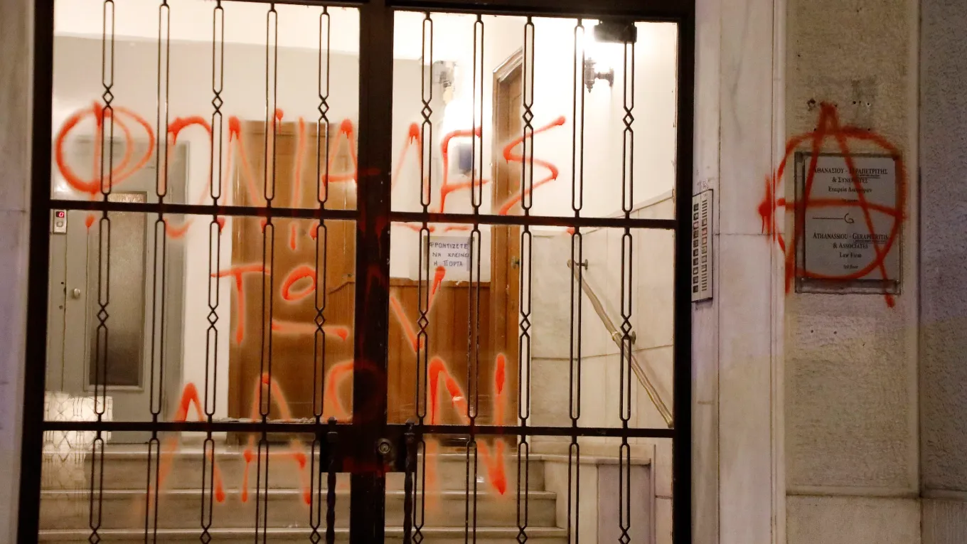 Μπογιές και συνθήματα στο δικηγορικό γραφείο του Γεραπετρίτη στο Κολωνάκι