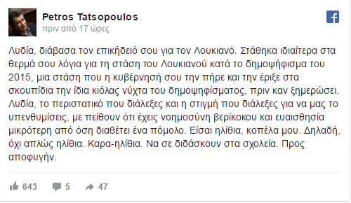 Απαντώντας μέσω του Facebook, ο Πέτρος Τατσόπουλος αναφέρει: «Λυδία, διάβασα τον επικήδειό σου για τον Λουκιανό. Στάθηκα ιδιαίτερα στα θερμά σου λόγια για τη στάση του Λουκιανού κατά το δημοψήφισμα του 2015, μια στάση που η κυβέρνησή σου την πήρε και την έριξε στα σκουπίδια την ίδια κιόλας νύχτα του δημοψηφίσματος, πριν καν ξημερώσει. Λυδία, το περιστατικό που διάλεξες και η στιγμή που διάλεξες για να μας το υπενθυμίσεις, με πείθουν ότι έχεις νοημοσύνη βερίκοκου και ευαισθησία μικρότερη από όση διαθέτει ένα πόμολο. Είσαι ηλίθια, κοπέλα μου. Δηλαδή, όχι απλώς ηλίθια. Καρα-ηλίθια. Να σε διδάσκουν στα σχολεία. Προς αποφυγήν».
