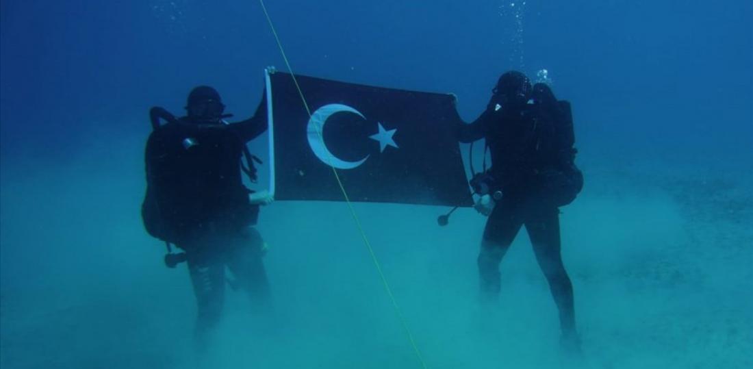 Σε μια από αυτές φαίνονται οι Τούρκοι δύτες να κρατούν την τουρκική σημαία ενώ βρίσκονται στο βυθό του λιμανιού της Σούδας.